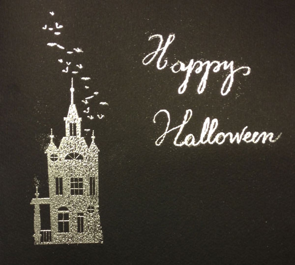 Nella foto sopra ho fatto una prova per Halloween, ho timbrato il soggetto ed ho sparso la polvere argento che a prima vista sembra grigia, solo scaldandola prende il colore definitivo, ho tolto quella in eccesso e poi ho passato l'embosser.